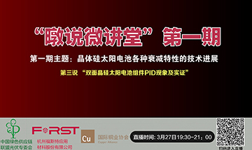 ECOPV晶體硅電池各種衰減特性技術(shù)專題即將線上開講 [2020-03-23][2020-03-23]中國綠色供應(yīng)鏈聯(lián)盟光伏專委會(ECOPV)線上課堂“暾說微講堂”第一期將于3月27日19:30開啟。特別支持單位:杭州福斯特應(yīng)用材料股份有限公司。福斯特總經(jīng)理周光大應(yīng)邀發(fā)表“雙面電池組件的PID現(xiàn)象與封裝方案”主題演講。[查看詳情]