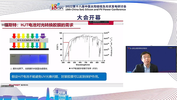 2022年12月8日至10日,第十八屆中國太陽級硅及光伏發電研討會(18th CSPV)在山西太原舉行。本次會議采取線上論壇的形式召開,福斯特等光伏企業協辦。在會議首日主會場論壇中,福斯特總經理周光大博士針對光伏市場主流的新電池技術闡述了福斯特的理解,提出了專業的解決方案,并做了題為《新型高效電池的封裝方案》的報告。