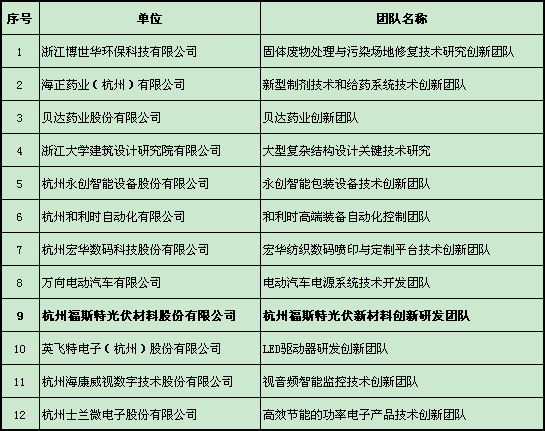 近日,經(jīng)單位申報(bào)、區(qū)縣(市)人力社保局推薦、市十大產(chǎn)業(yè)辦審核、專(zhuān)家評(píng)審、答辯,杭州福斯特光伏材料股份有限公司的“杭州福斯特光伏新材料創(chuàng)新研發(fā)團(tuán)隊(duì)”入選杭州市第一批市級(jí)十大產(chǎn)業(yè)企業(yè)技術(shù)創(chuàng)新團(tuán)隊(duì)。