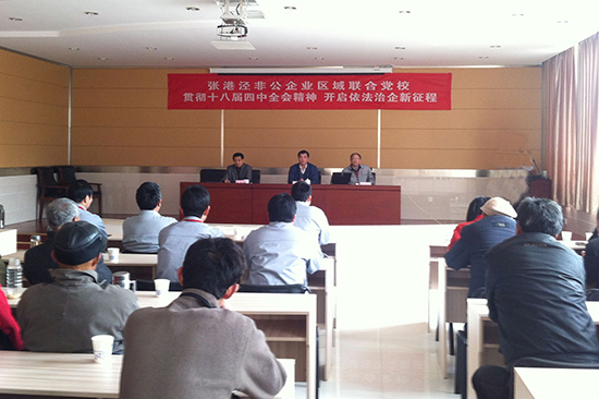 4月9日下午,張港涇村非公企業(yè)聯(lián)合黨校黨課教育活動在蘇州福斯特舉行?;顒犹匮J焓形h校高級講師邵鐳以“貫徹十八屆四中全會精神,開啟依法治企新征程”為主題作專題講座,村黨委全體黨員和轄區(qū)企業(yè)黨員干部共90多人參加了本次活動。