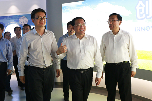浙江省委副書記、省長李強(中),杭州市委副書記、市長張鴻銘(右)在福斯特董事長林建華的陪同下參觀新材料研究院