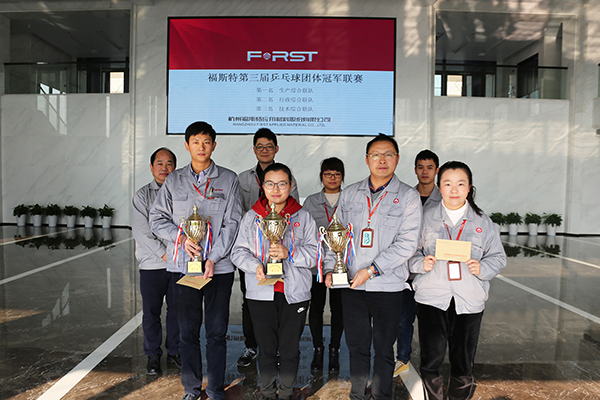 為推進公司企業文化建設工作,發揚廣大員工興趣愛好,由福斯特工會主辦,企業文化推進辦公室、乒乓球興趣小組協辦的第三屆乒乓球團體冠軍聯賽于日前落下帷幕。在12月1日進行的決賽中,生產綜合聯隊以總比分3:2戰勝行政綜合聯隊,勇奪本屆賽事冠軍。