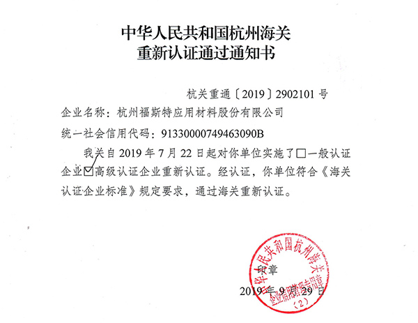 日前,福斯特順利通過了標準改版升級后海關AEO高級認證的重新認證,獲中華人民共和國杭州海關頒發的重新認證通過通知書(杭關重通[2019]2902101號),標志福斯特管理體系得到了海關AEO高級認證的驗審認可。