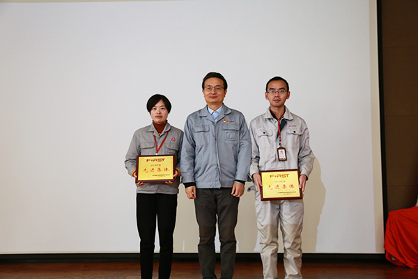 為表彰先進、鼓舞士氣,公司對先進集體(2名)、先進班組(3名)、5S優勝單位(1名)、“安康杯”優勝單位(3名)共9個集體班組和部門單位進行了表彰,同時還表彰了優秀員工(73名)、員工新秀(6名)、愛廠敬業五年獎(85名)、愛廠敬業十年獎(57名)、愛廠敬業十五年獎(13名)、愛廠敬業二十年獎(5名)、特別奉獻獎(3名)、工會積極分子(43名)、黨員積極分子(3名)等288名員工。隨后,優秀員工、員工新秀以及愛廠敬業員工代表發言,對公司表示感謝,并明確了未來工作努力的方向。
