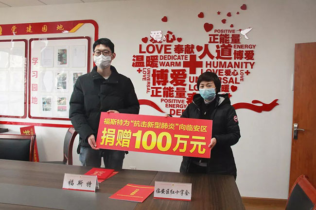 福斯特積極聯(lián)系臨安區(qū)紅十字會(huì),捐款100萬元用于區(qū)疫情前線抗擊及防治工作,1月31日,全部款項(xiàng)已落實(shí)到位。